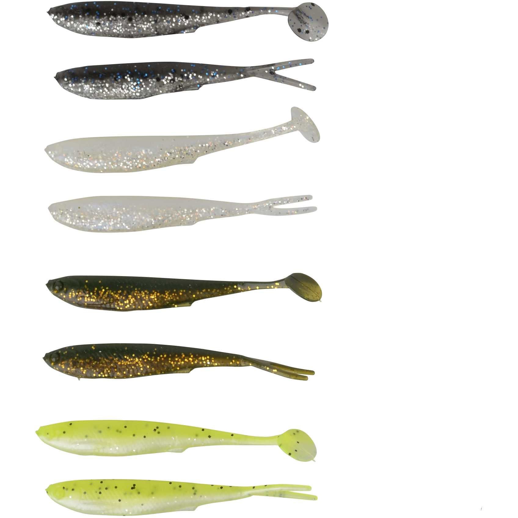 4 x 3D Fry V-Tail 6,5 cm (Dirty Silver, Motor Oil, Pearl Silver, Yellow Chart Pearl)